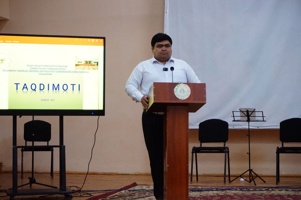 Master-klass davomida Zarbdor tuman 17-son madaniyat markazining badiiy rahbari, rejissyori, madaniy-ma’rifiy ishlar bo‘yicha bosh mutaxassislari tomonidan madaniyat markazlarida dasturlar, tadbirlar rejalari, xodimlar shaxsiy ish rejalari va hisobotlarini yuritish bo‘yicha tushunchalar berib o‘tildi.