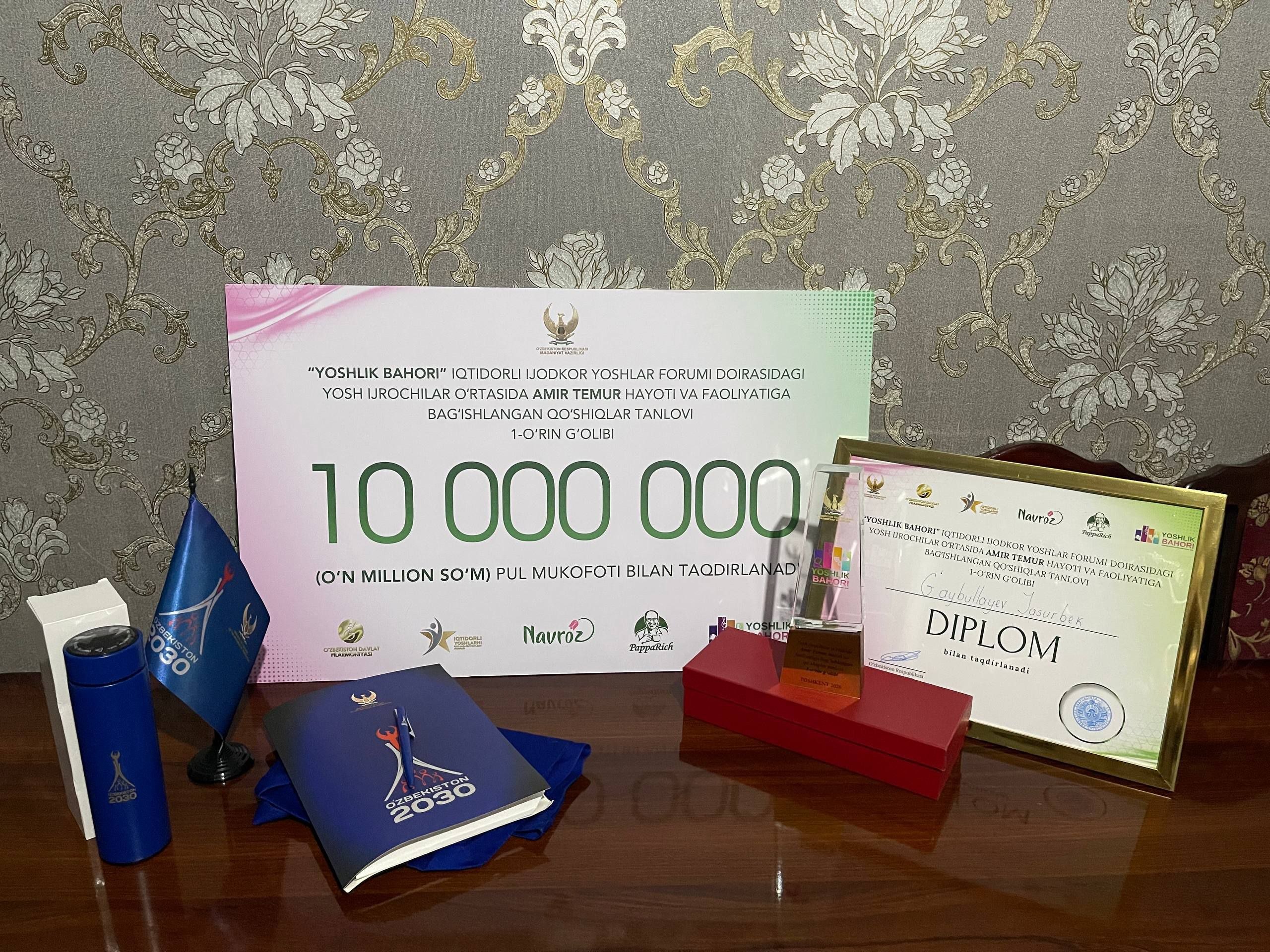 Tanlovda Jizzax viloyati Yangiobod tumanidan iqtidorli yosh ijodkor — G‘aybullayev Jasurbek Xasanboy o‘g‘li munosib ishtirok etib, faxrli 1-o‘rinni qo‘lga kiritdi hamda I-darajali diplom va 10 000 000 so‘m pul mukofoti bilan taqdirlandi.